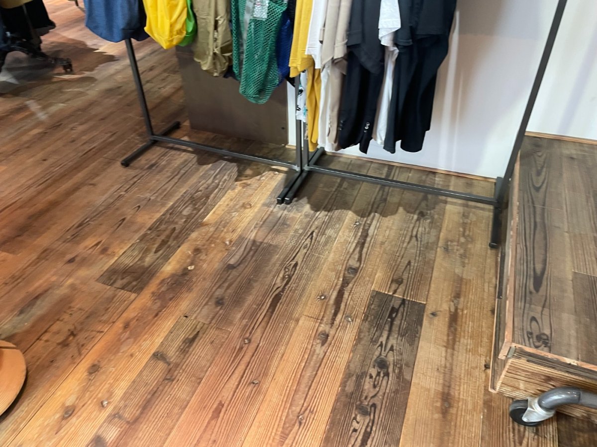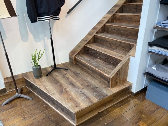 オーク古材の表面からわずかに内部に入った部分を使用し、古材感を残しつつも上品に仕上げました。木目を浮き立たせ、さらにサンディング処理でなめらかさを持たせることにより古材でありながら手触りの良いフローリング材です。