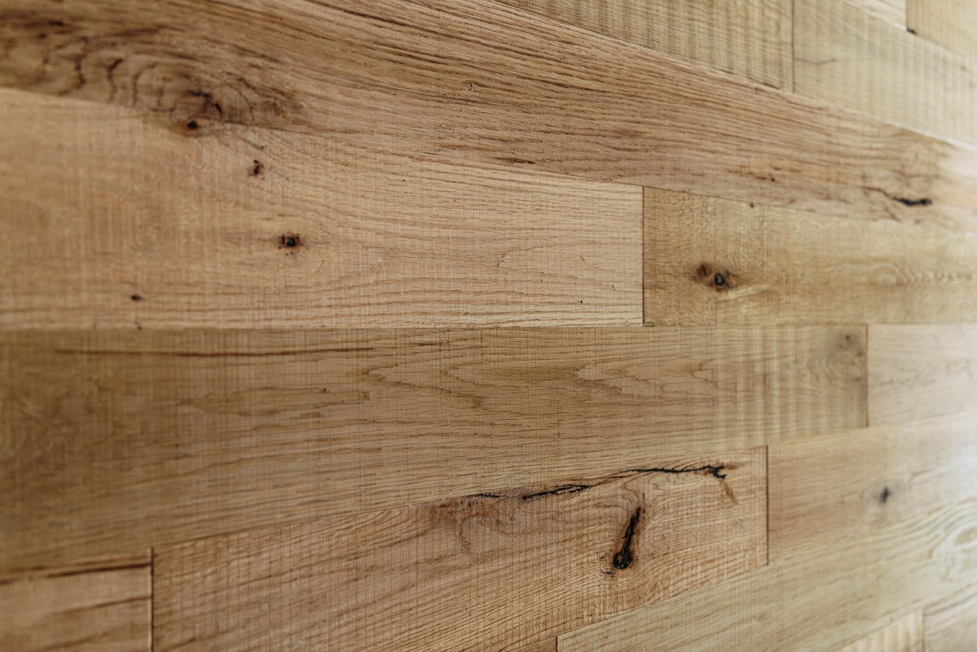 オーク古材の表面からわずかに内部に入った部分を使用し、古材感を残しつつも上品に仕上げました。木目を浮き立たせ、さらにサンディング処理でなめらかさを持たせることにより古材でありながら手触りの良いフローリング材です。