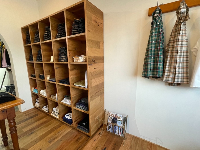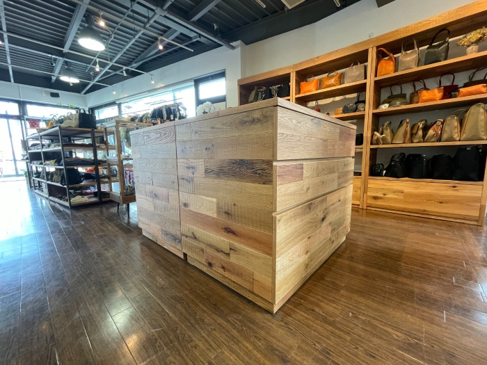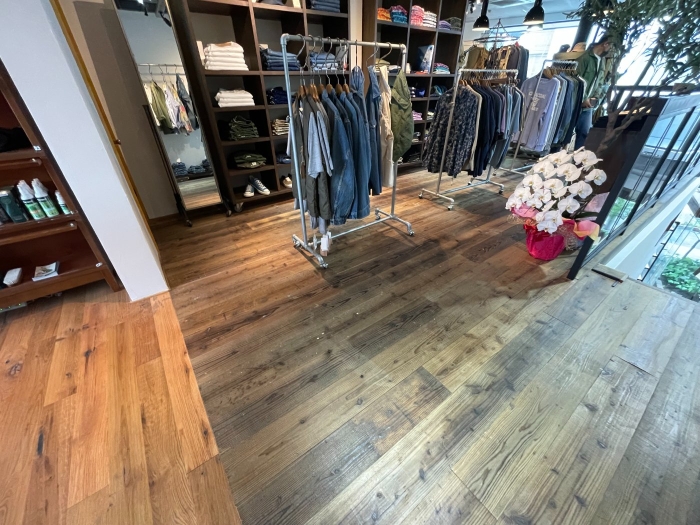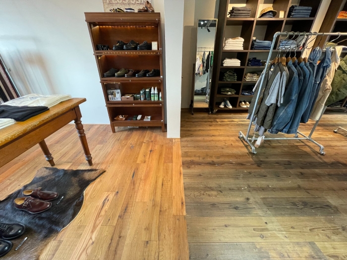 オーク古材の表面からわずかに内部に入った部分を使用し、古材感を残しつつも上品に仕上げました。木目を浮き立たせ、さらにサンディング処理でなめらかさを持たせることにより古材でありながら手触りの良いフローリング材です。