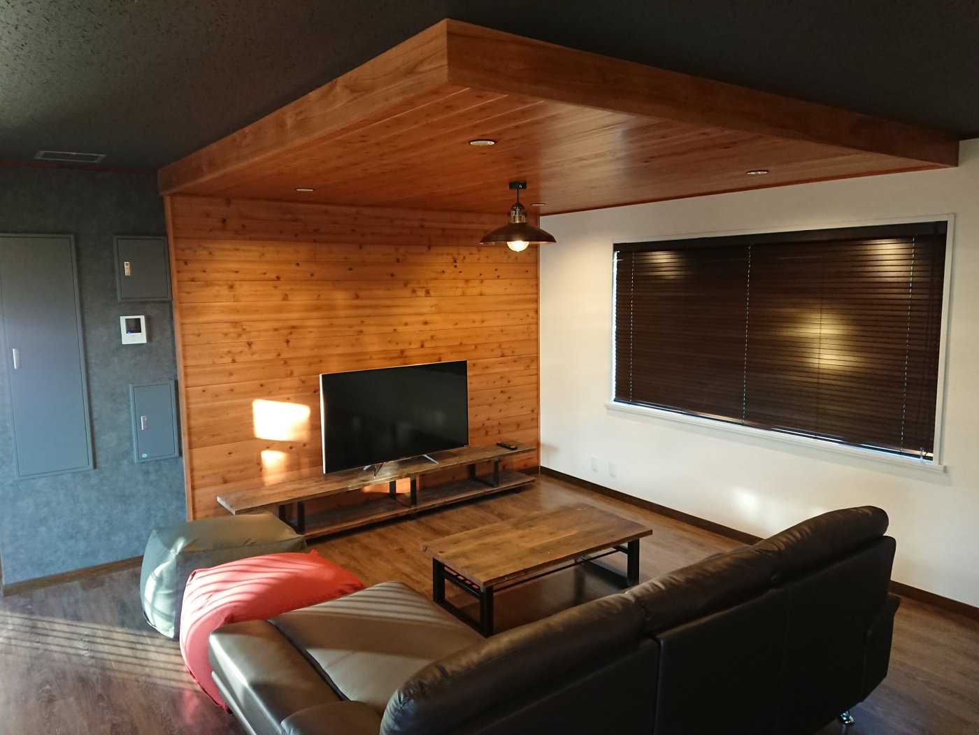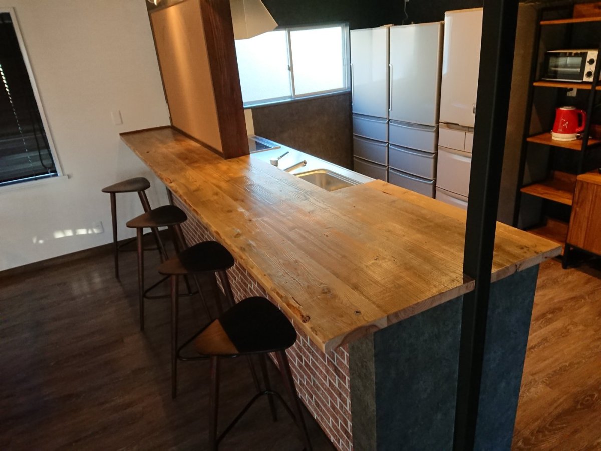 キッチンカウンター、ダイニングテーブル、センターテーブル、飾棚の棚板を古材板材(古材足場板)を使用いただきました。
