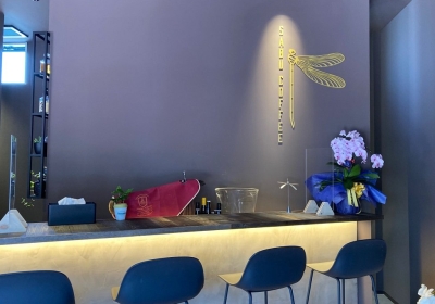 トンボがシンボルマークのカフェ 古材の中でも優しい印象のレイクボードで上品なカウンターが出来上がりました